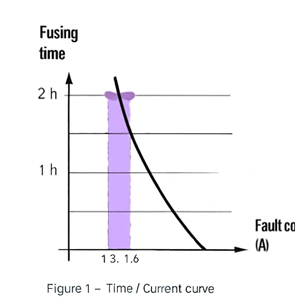 This curve shows how quickly a fuse reacts to overcurrent. The time it takes to break the circuit is inversely proportional to the current — the higher the overcurrent, the faster the fuse operates.